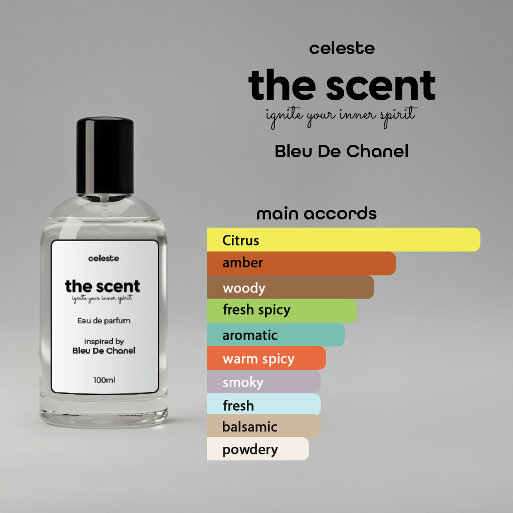 Celeste Inspired by Bleu de Chanel – The Scent is a sophisticated masculine fragrance that balances freshness with timeless elegance. It opens with vibrant citrus and mint, transitions into an aromatic heart of ginger, jasmine, and nutmeg, then deepens into a woody base of sandalwood, cedar, patchouli, and incense. Refined, long-lasting, and versatile, Celeste is perfect for day or night, leaving a powerful yet elegant impression of confidence and class.