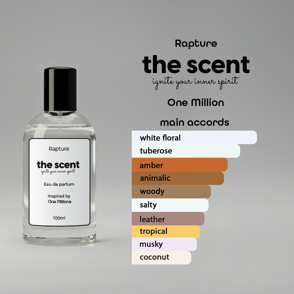 Rapture Inspired by One Million – The Scent is a daring masculine fragrance that embodies luxury, power, and seduction. It opens with sparkling notes of grapefruit, mint, and blood mandarin, unfolds into a spicy heart of cinnamon and rose, then settles into a bold base of leather, amber, and patchouli. Intense and long-lasting, Rapture is perfect for men who command attention and want to leave a trail of irresistible allure.